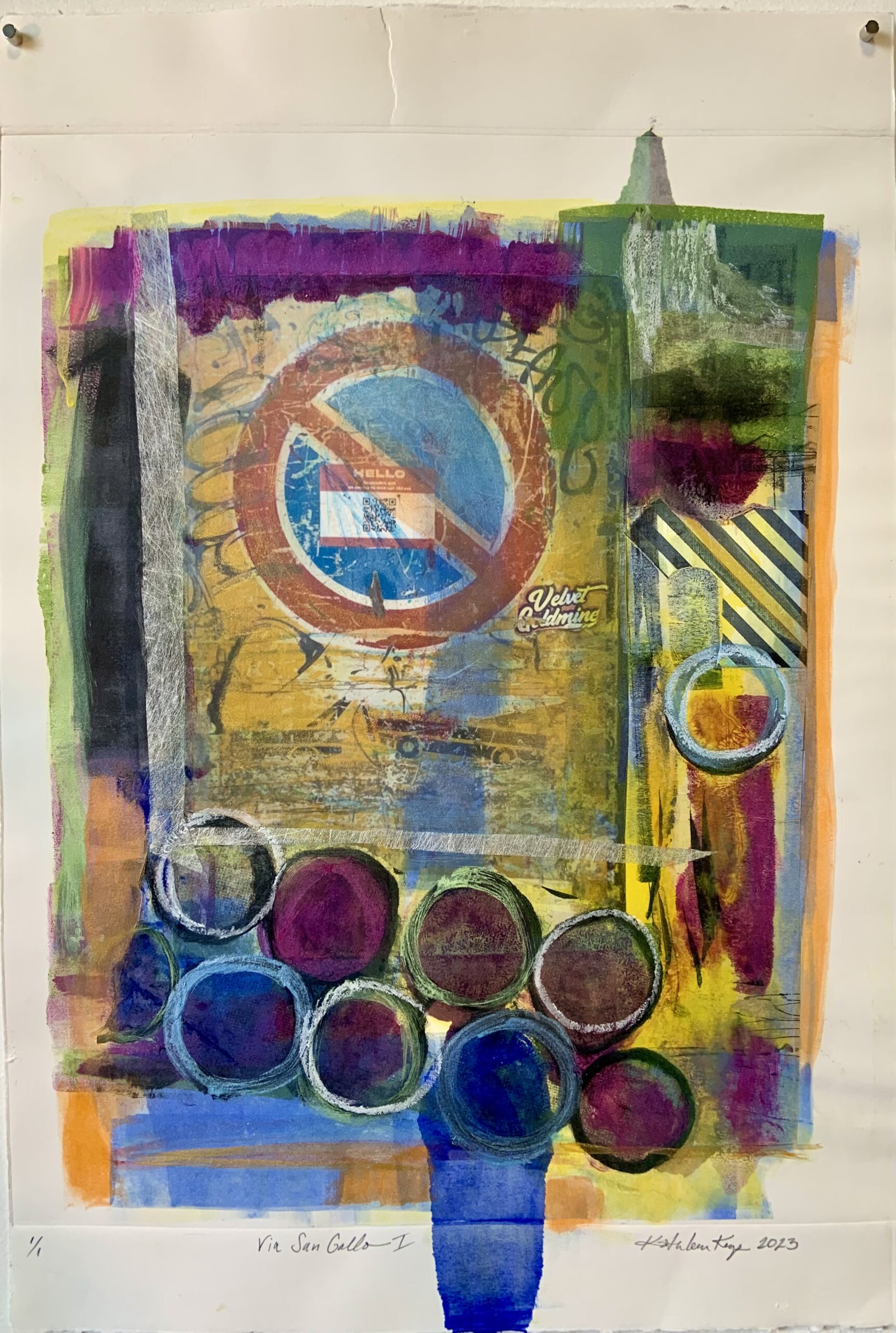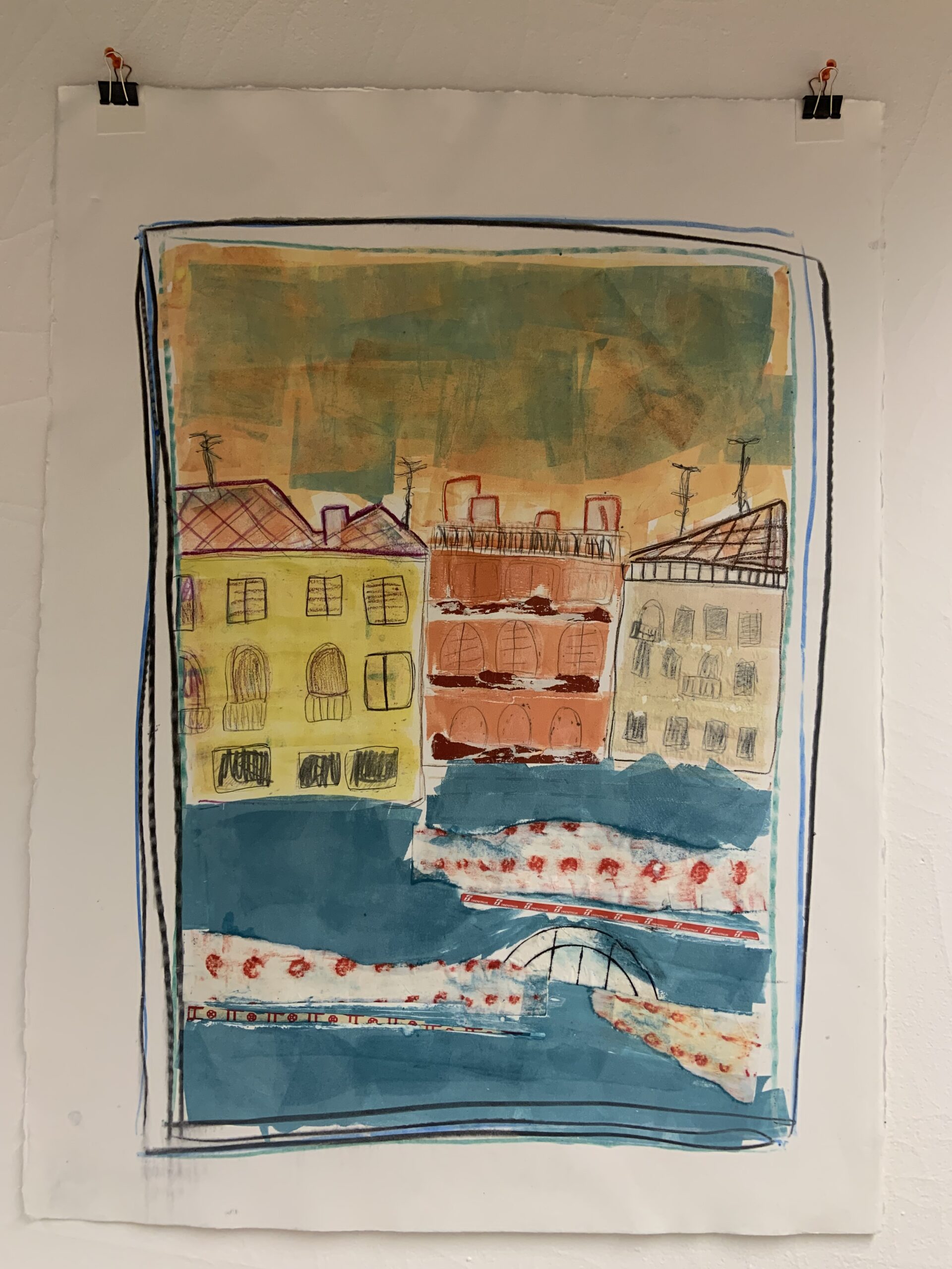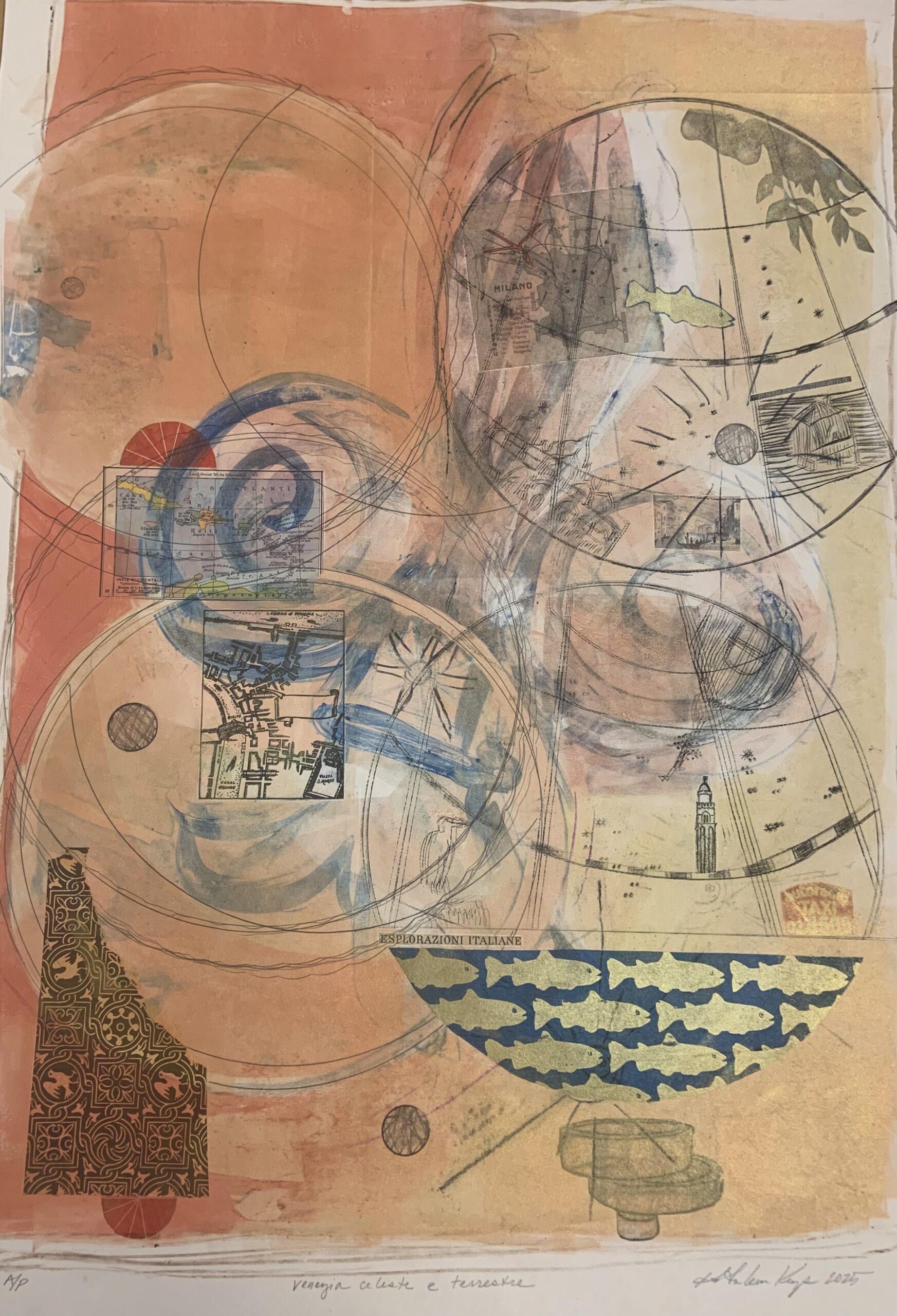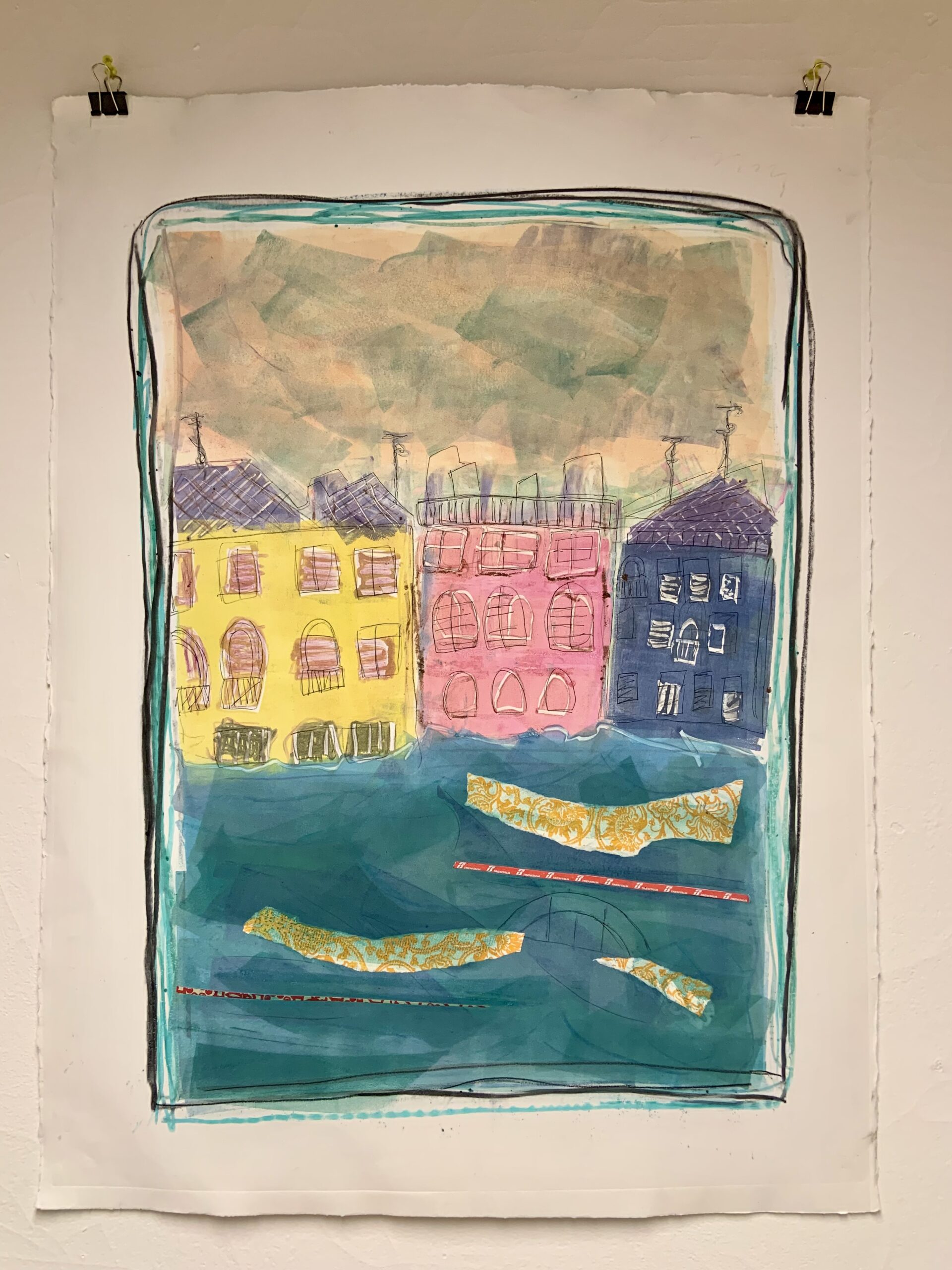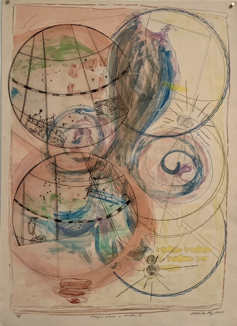 "Homehouse" Series: One to Four, 2024 Mixed media monotypes The "Homehouse" series consists of four mixed media monotypes. It explores the interplay between home as a personal and collective emotional space and house as a physical structure. The combined term, Homehouse, reflects this fused blending. Each work examines what makes a space both a home and a house, as well as a rich repository of experience, growth, and shared history. Employing broad, vibrant areas of intense, energetic color combined with chine collé to keenly represent studies, interests, and travels, the monotypes mark both personal milestones and the collective evolution of the family. Delicately reflecting themes of change and impermanence, the unfinished structures in the Homehouse monotype series also suggest loss, transformation, and the passage of time. Overall, the layered contrasts in the works aim to create a complex portrayal of family life and to reflect both the joyful and bittersweet experience as the youngest family member prepares to step into the future outside of the spaces and daily evolution of "Homehouse." "View from the Grand Canal": One and Three, 2025 Mixed media monotypes These two mixed media monotypes, from a variable series of three, explore the intensity of change in the light and color on the Grand Canal in Venice, Italy, just before and after a storm.