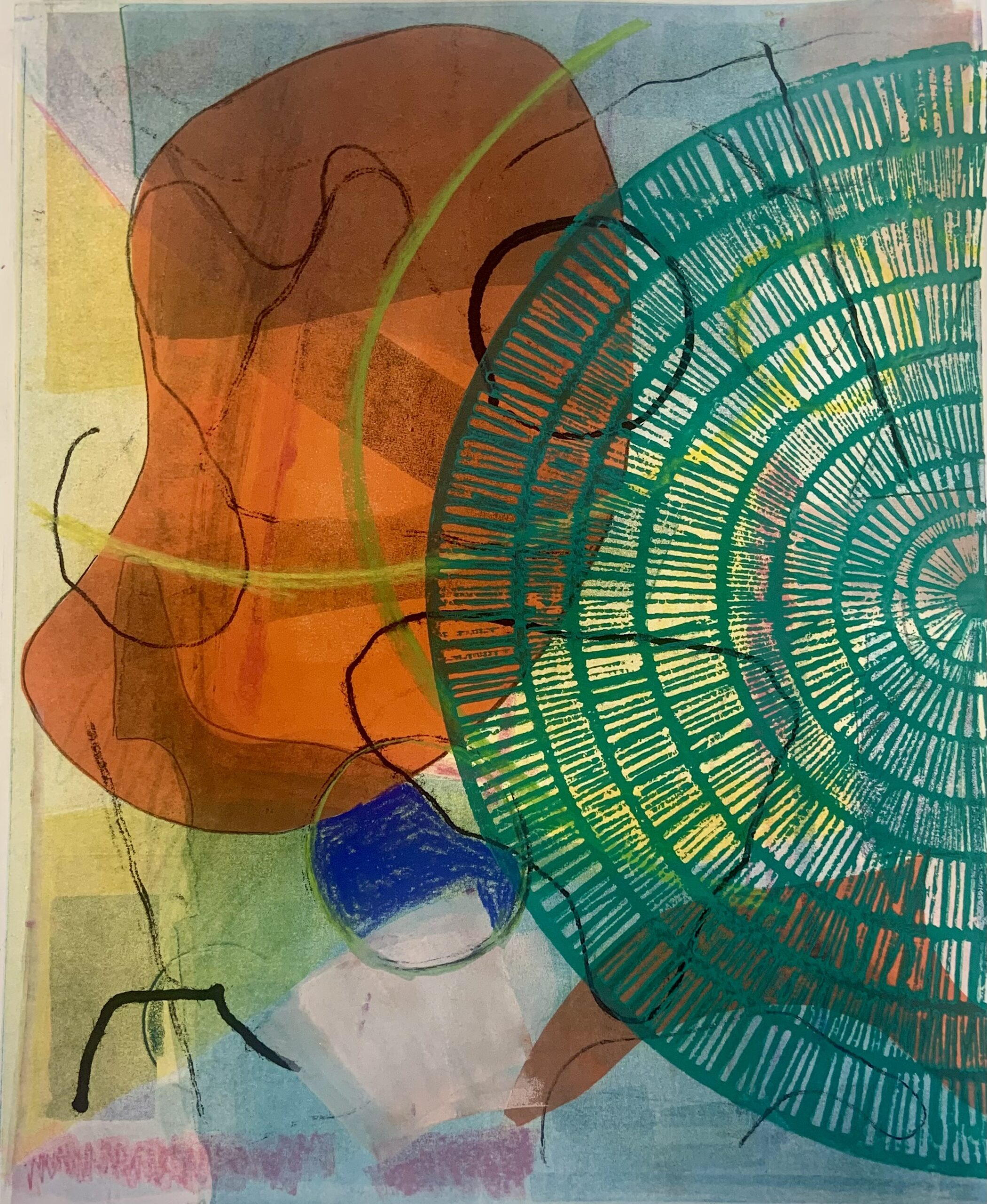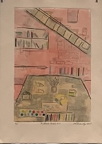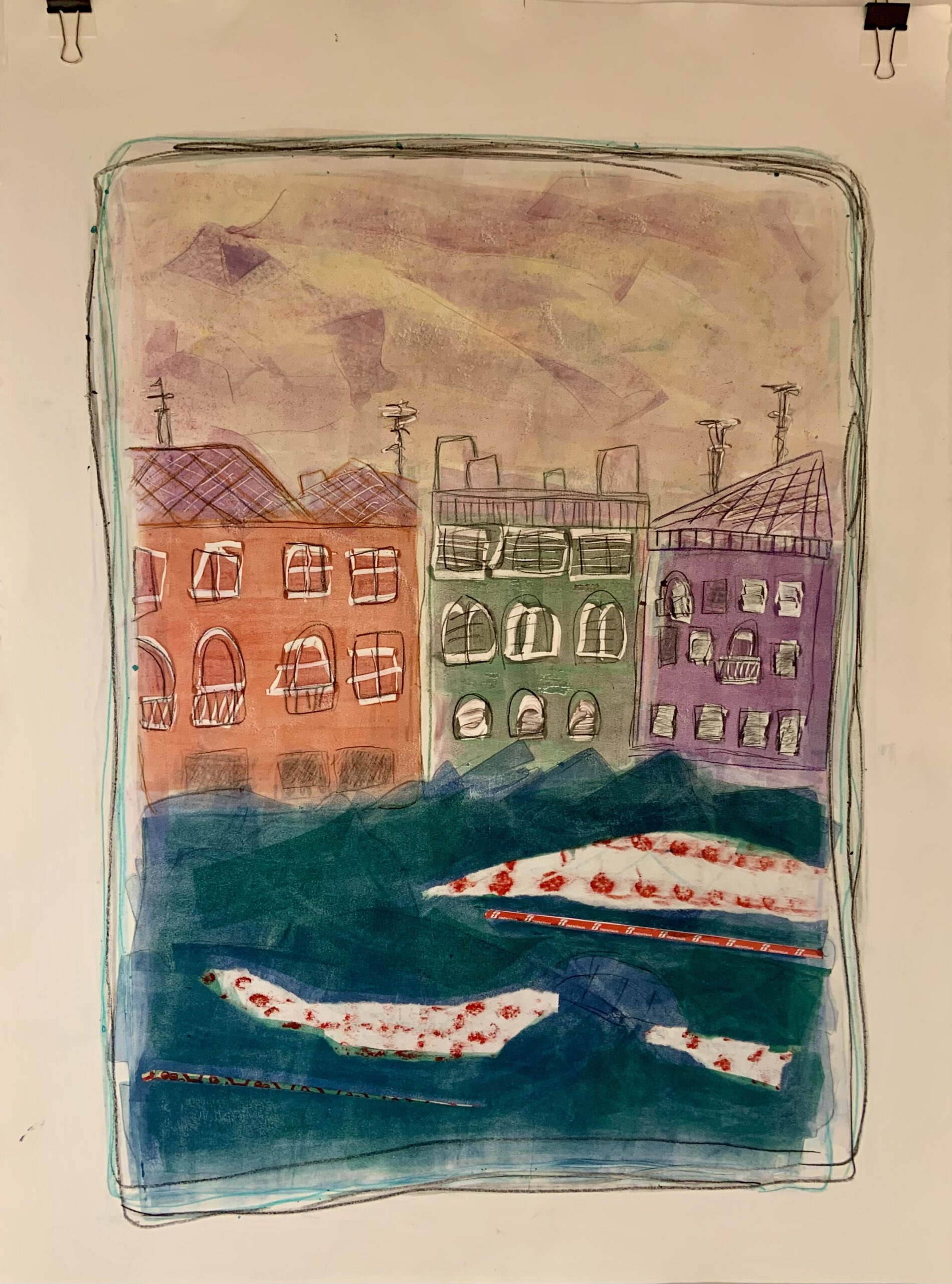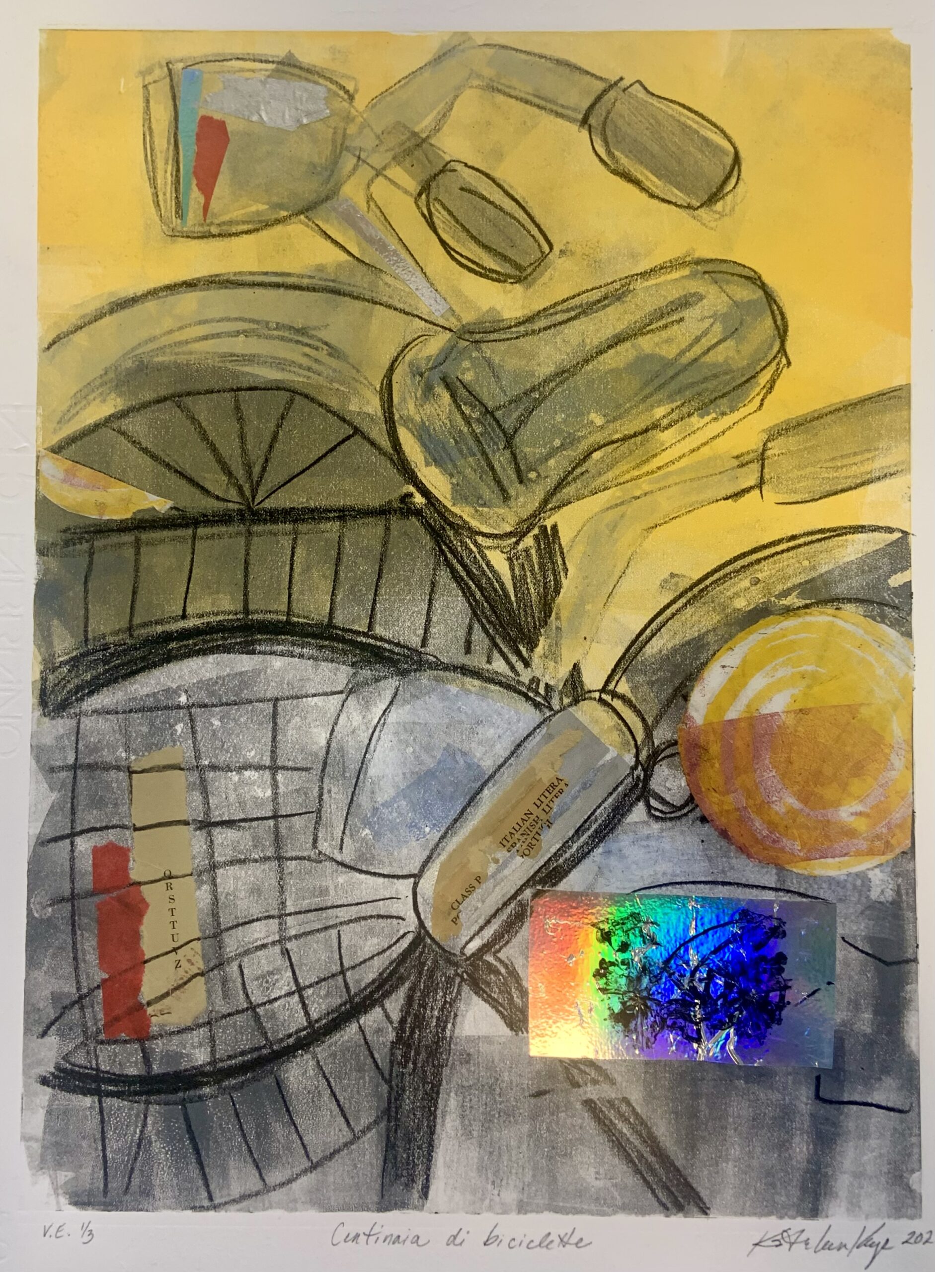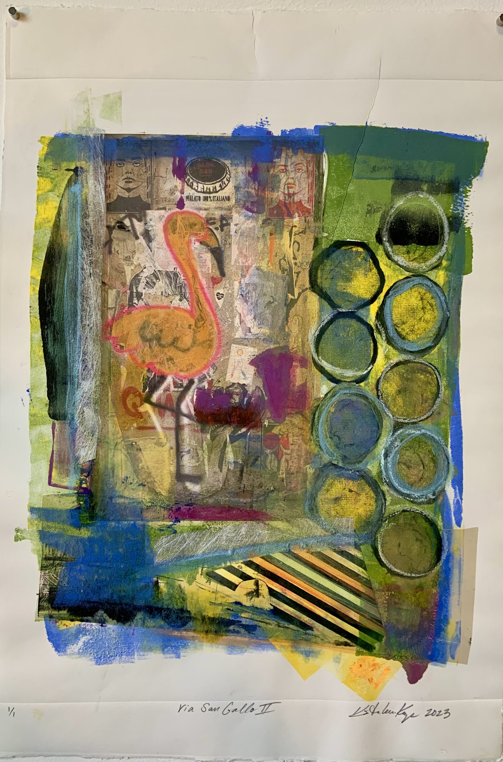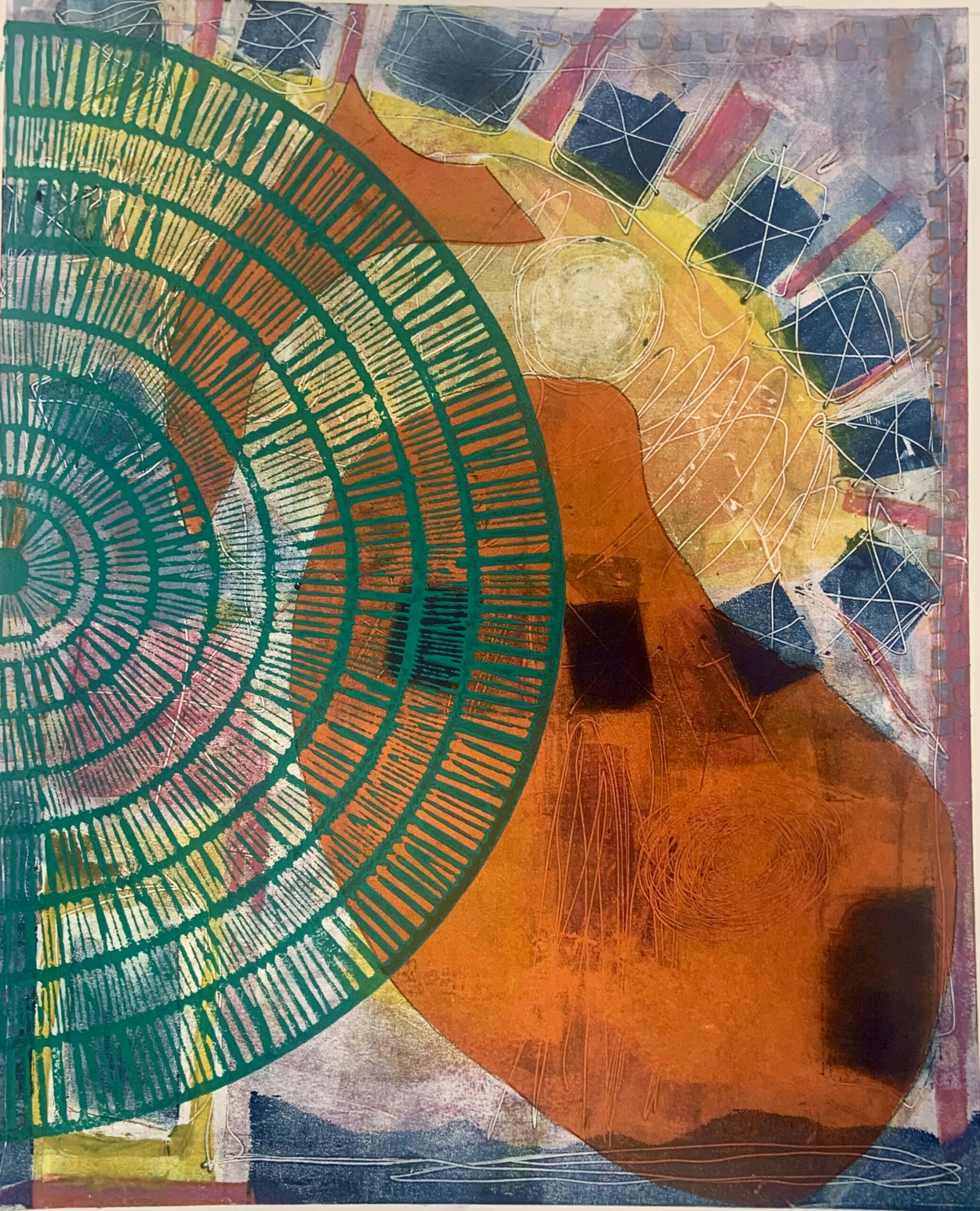 "Homehouse" Series: One to Four, 2024 Mixed media monotypes The "Homehouse" series consists of four mixed media monotypes. It explores the interplay between home as a personal and collective emotional space and house as a physical structure. The combined term, Homehouse, reflects this fused blending. Each work examines what makes a space both a home and a house, as well as a rich repository of experience, growth, and shared history. Employing broad, vibrant areas of intense, energetic color combined with chine collé to keenly represent studies, interests, and travels, the monotypes mark both personal milestones and the collective evolution of the family. Delicately reflecting themes of change and impermanence, the unfinished structures in the Homehouse monotype series also suggest loss, transformation, and the passage of time. Overall, the layered contrasts in the works aim to create a complex portrayal of family life and to reflect both the joyful and bittersweet experience as the youngest family member prepares to step into the future outside of the spaces and daily evolution of "Homehouse." "View from the Grand Canal": One and Three, 2025 Mixed media monotypes These two mixed media monotypes, from a variable series of three, explore the intensity of change in the light and color on the Grand Canal in Venice, Italy, just before and after a storm.