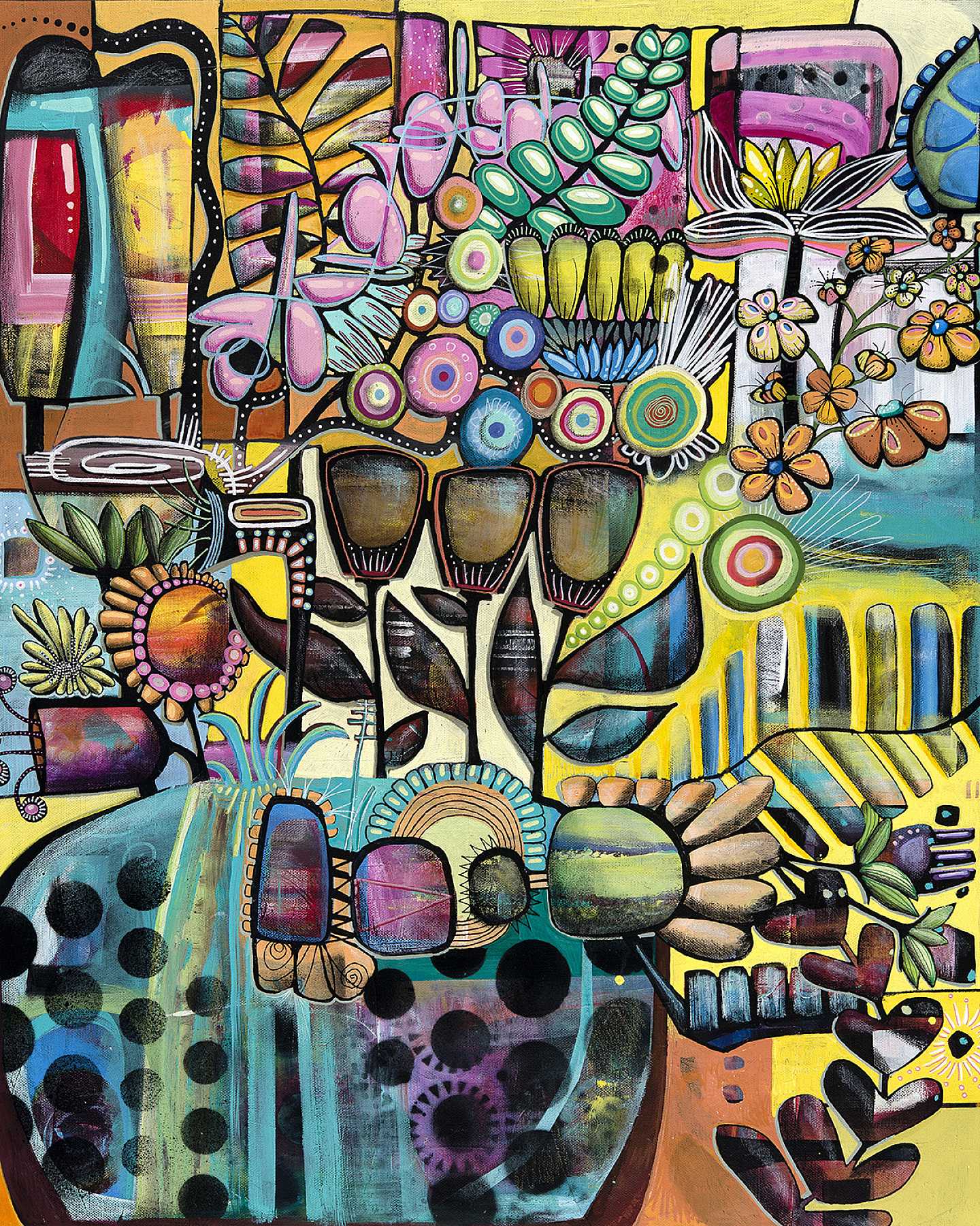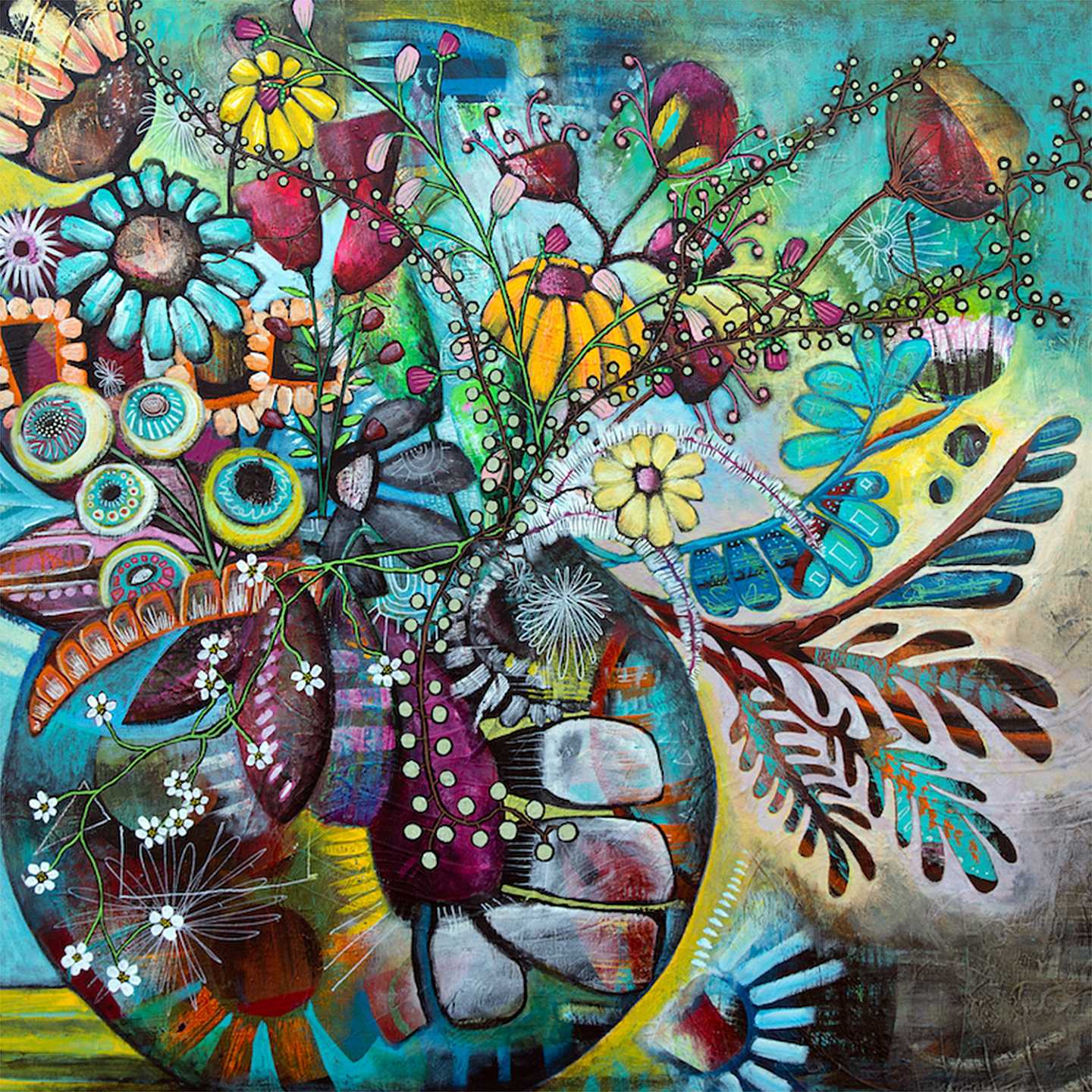 There are so many ways to look at things, maybe that is why I rotate my canvas when I paint. I use mixed media and acrylics to add layers. I begin with the movement of paint across canvas, sometimes blending and smearing colors with my fingers. Shapes and textures form, and images are revealed to me. A final piece often has 2-3 paintings underneath; each one a different story, emotion or interaction with the world that I am trying to process. With each creation, I feel the struggle of the human spirit; to let go, be free, to play without boundaries verses the constraints of needing to control the details of life, interactions and the manners for which we accomplish things. Within each piece there is a duality of this act of letting go and the need for control.