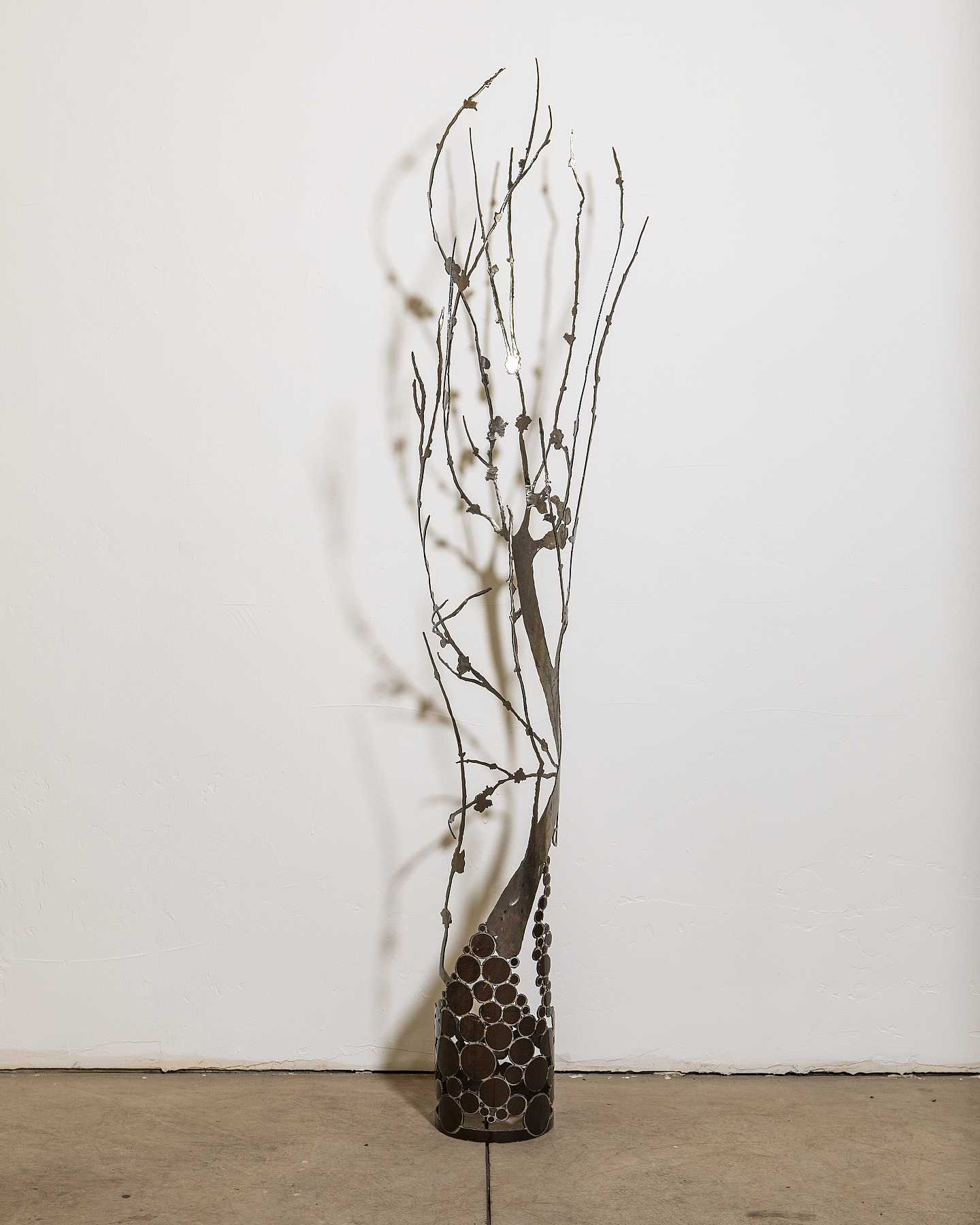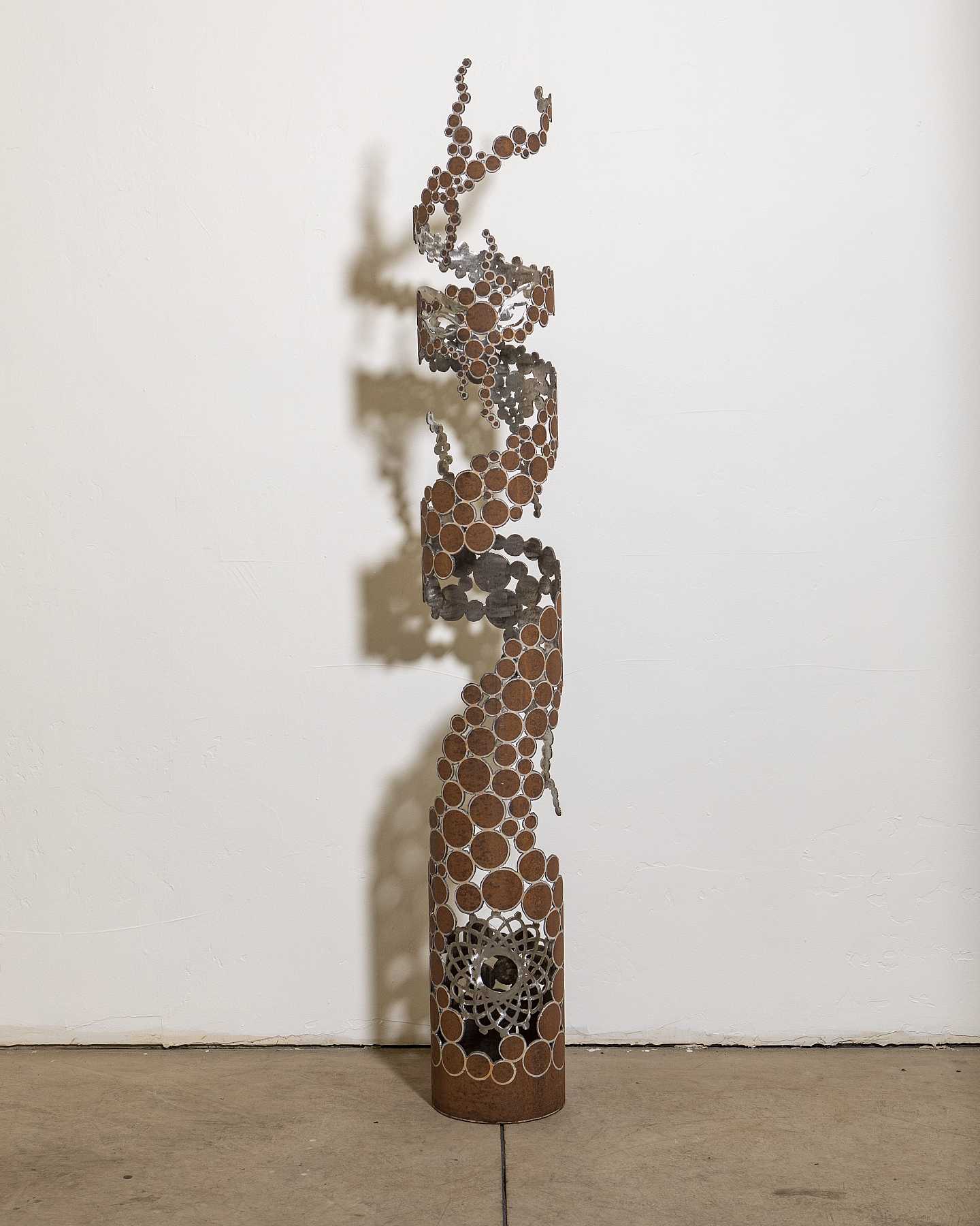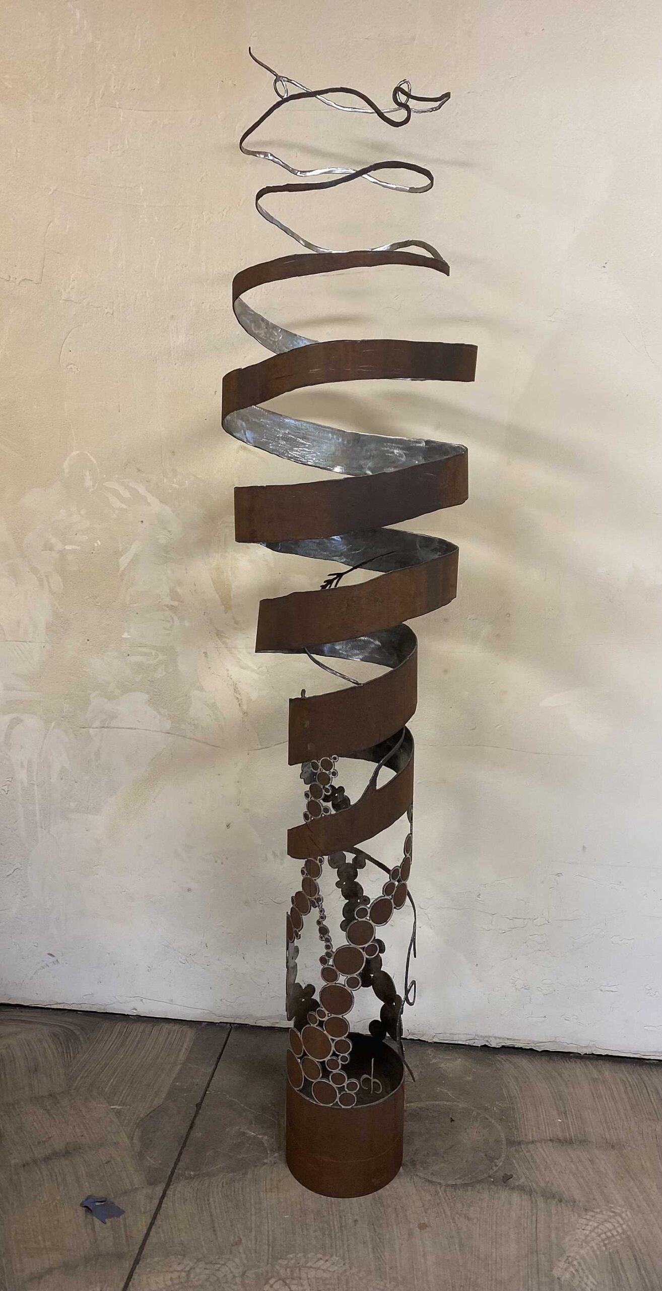 Primarily self taught, Bellamy’s labor intensive, free form, low-tech fabrication process results in original, engaging, often kinetic sculptures. Most metal sculptors work in an additive process or by mold making and casting. D’Arcy works more like a stone carver. Starting with a length of pipe, he adds only space. He describes this free form process of cutting and bending as “subtractive fabrication”. Each sculpture is completely unique, there is no casting or duplication of any kind. Most of his current work is between 6’ and 8’ tall.