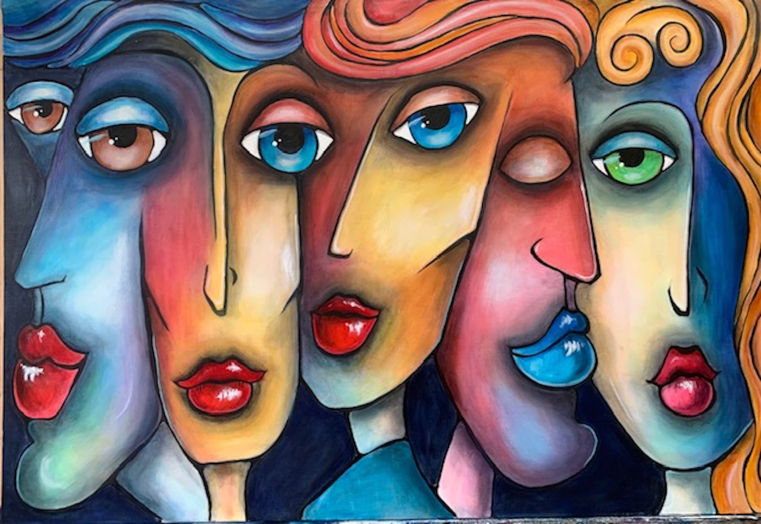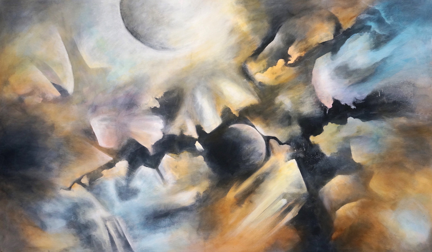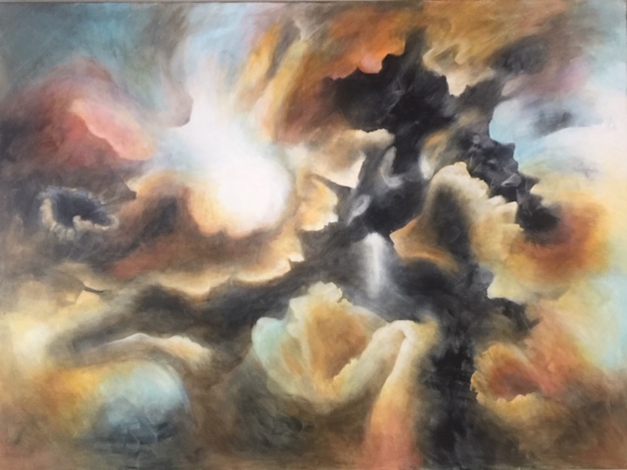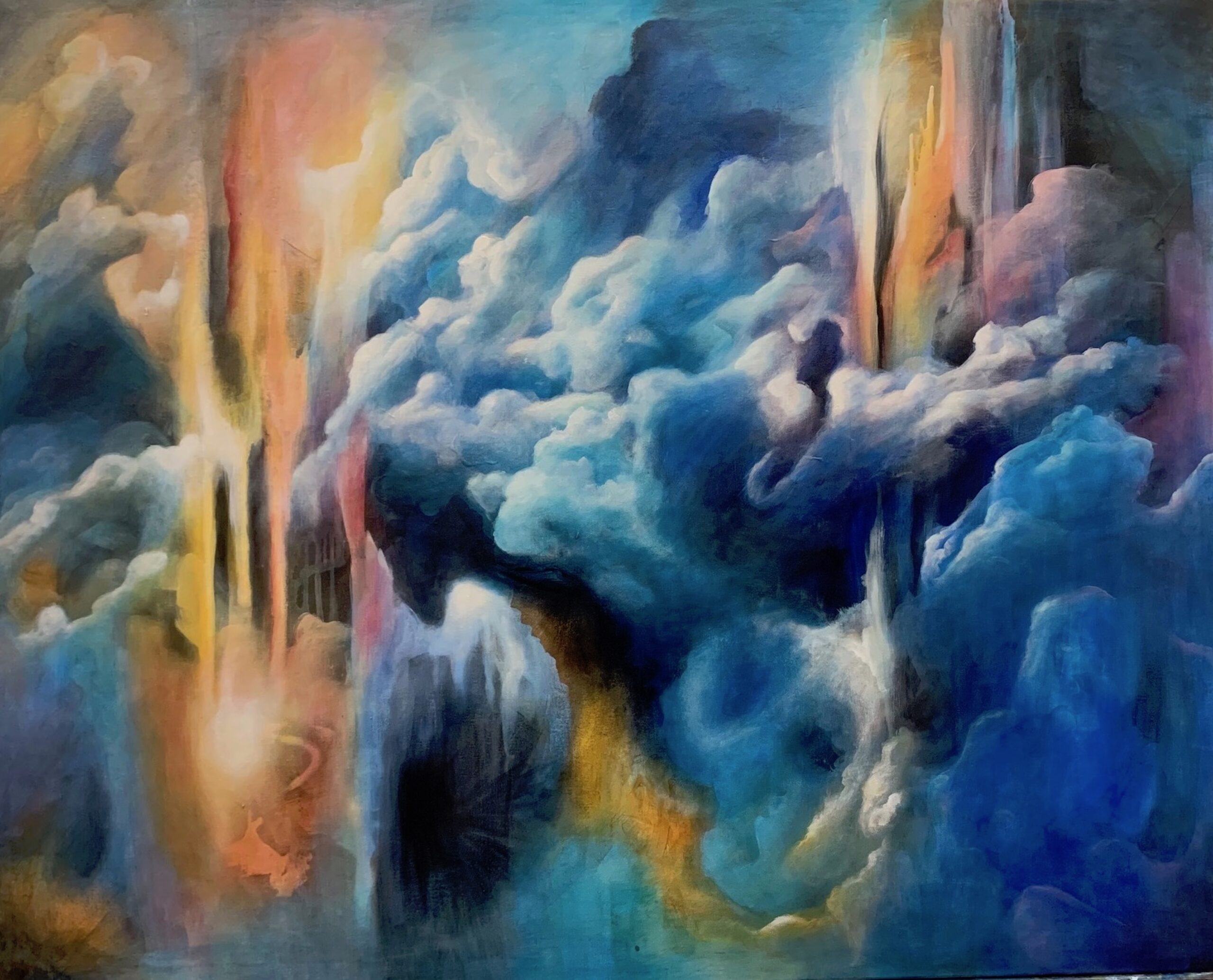 My life has followed two parallel tracks. Professionally, I’ve had careers focused on service work: nursing, psychotherapy, Hakomi (Somatic Psychotherapy) Teacher. At the same time, I’ve followed a variety of artistic paths to express my vision of the inner human world, of nature and and our interaction with the world around us through photography, oil painting, ceramics, sculpting, pastels, acrylic painting and collage. Abstract painting was a surprise to me. It is as though an invisible thread pulled me through everything I have painted from oil to acrylic to oil again, from otherworldly abstract cloud-like landscapes to allegorical images. I love all the possibilities.